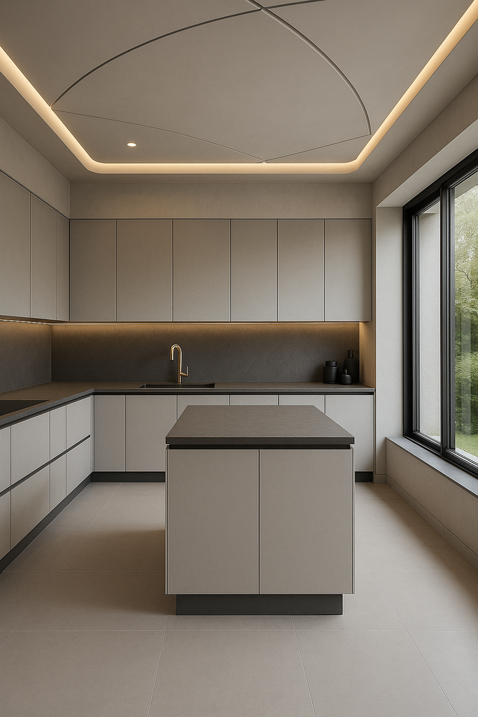 Walnut, oak, white stone, matte black handles, rose-gold accents |