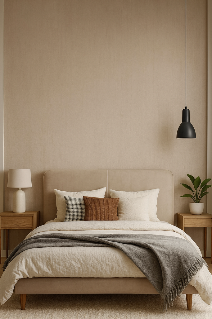 White oak, warm walnut, matte black accessories, champagne gold, cream textiles |