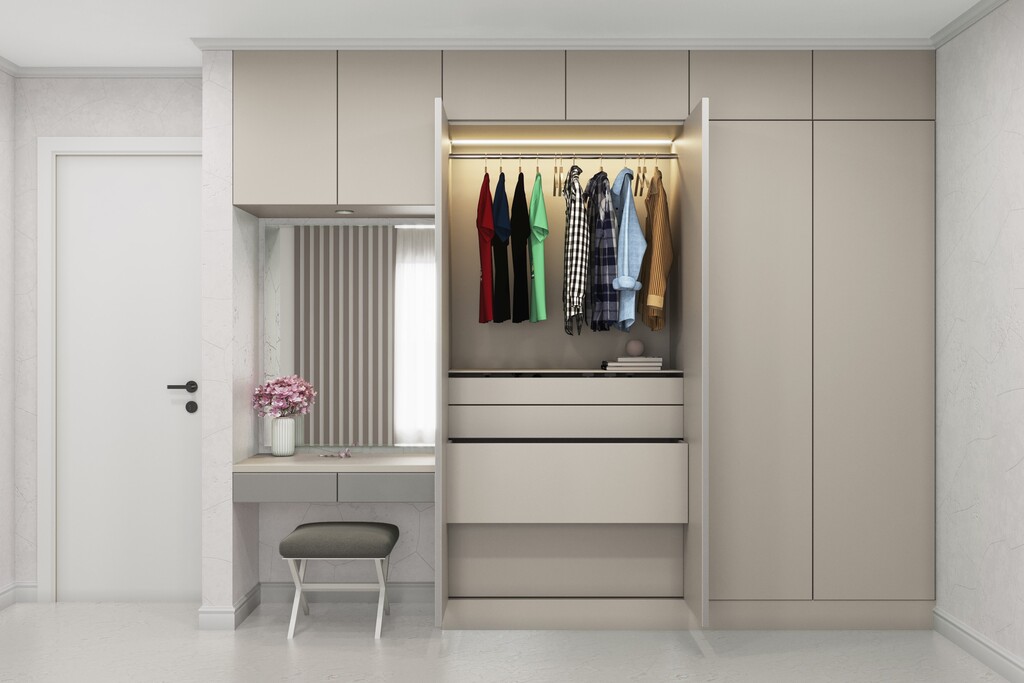 Render a luxury wardrobe finished in Soft Pearl Beige Thermolam with soft ambient lighting. |