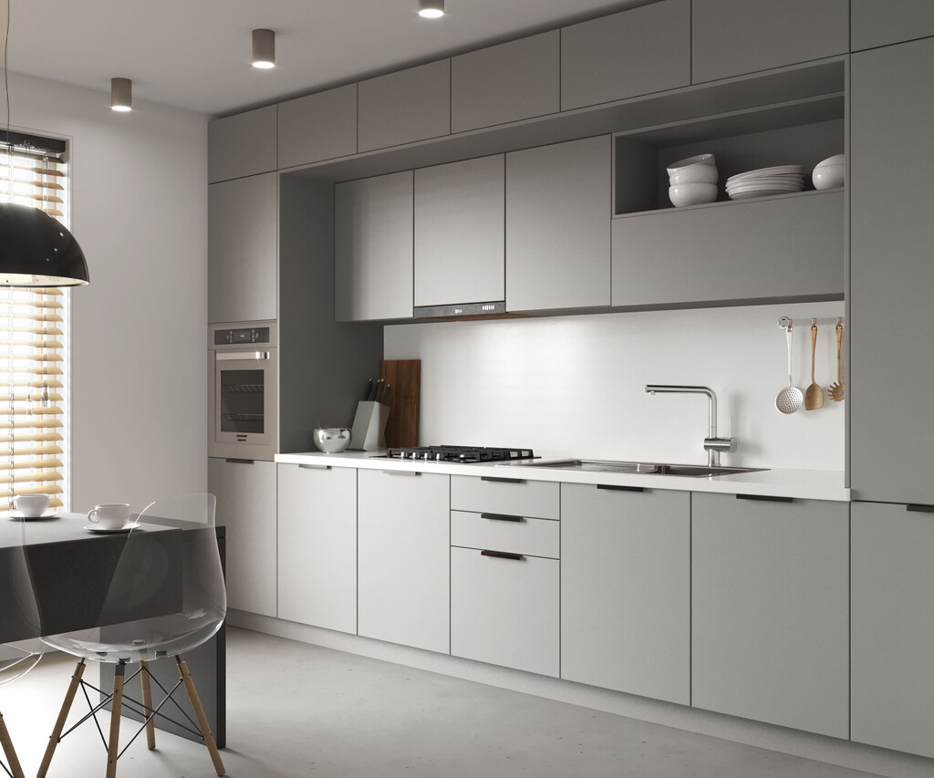 Render a modular kitchen finished in Misty Grey Thermolam with black accents. |