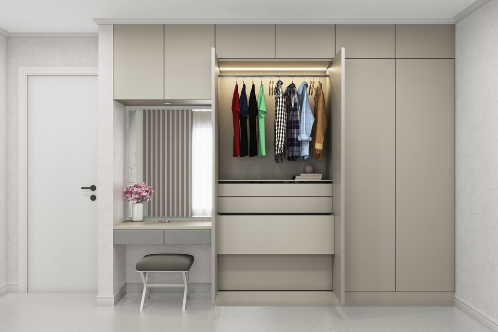 Render a modern bedroom wardrobe in Ivory Mist Thermolam with soft white LED backlighting. |