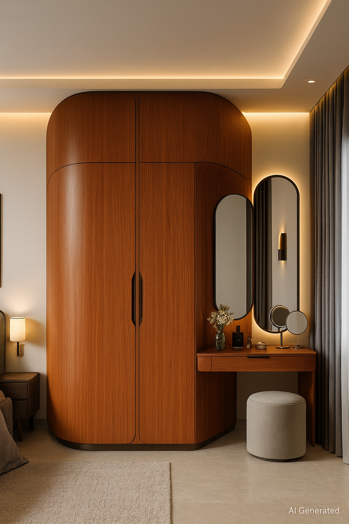 Vertical grain lines elongate walls and wardrobes, adding height and elegance. |