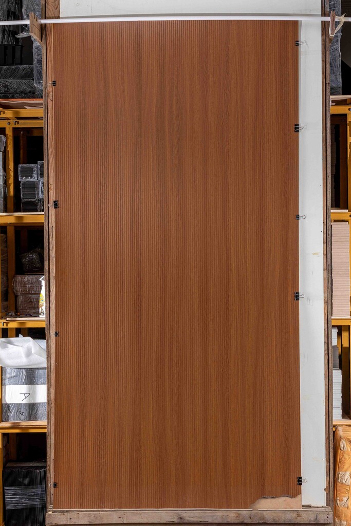 teak wood laminate, warm brown HPL, linear wood finish |