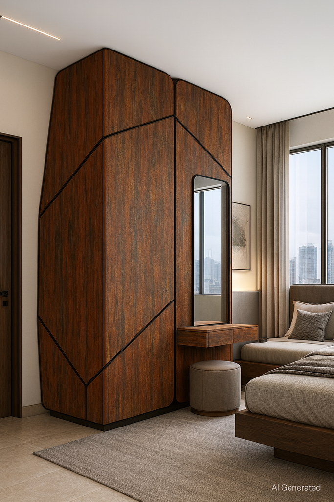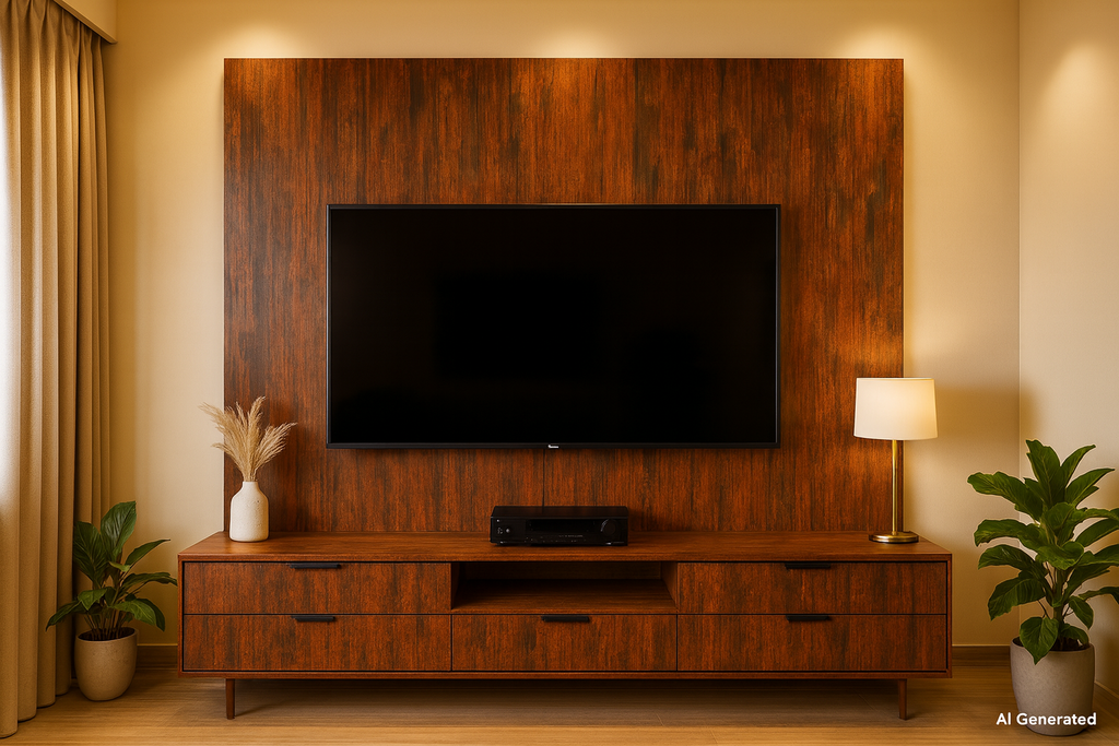 Rustic Burnt Umber Laminate on plywood, including surface preparation, PU adhesive, matching 1mm edge banding, precision trimming and finishing. Suitable for wardrobes, wall panels, counters and cabinetry. Rate includes consumables, screws, wastage allowance, protection, touch-ups,. |