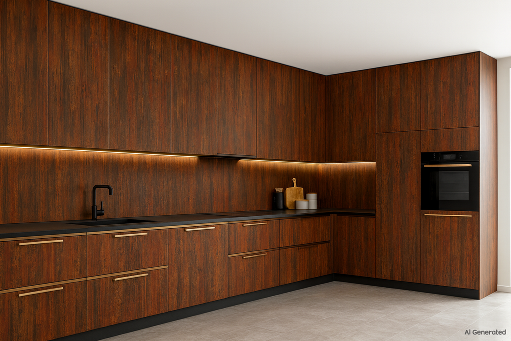 Rustic Burnt Umber - A bold, rust-inspired laminate finish for industrial and statement interiors. |