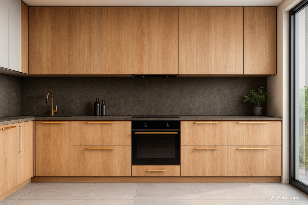 Honeywood Oak Grain Laminate on plywood, including surface preparation, PU adhesive, matching 1mm edge banding, precision trimming and finishing. Suitable for wardrobes, wall panels, counters and cabinetry. Rate includes consumables, screws, wastage allowance, protection, touch-ups,. |