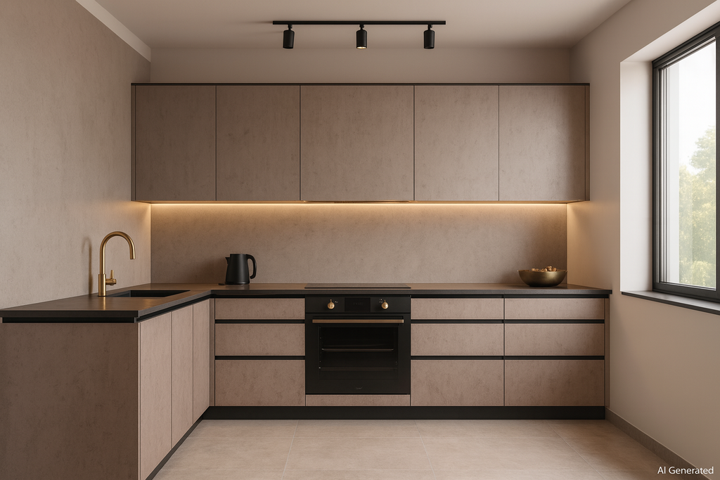 Smoky Mauve Concrete Laminate applied on plywood using adhesive including cutting, pasting and finishing work ensuring neat alignment and durable interior surface installation.. |