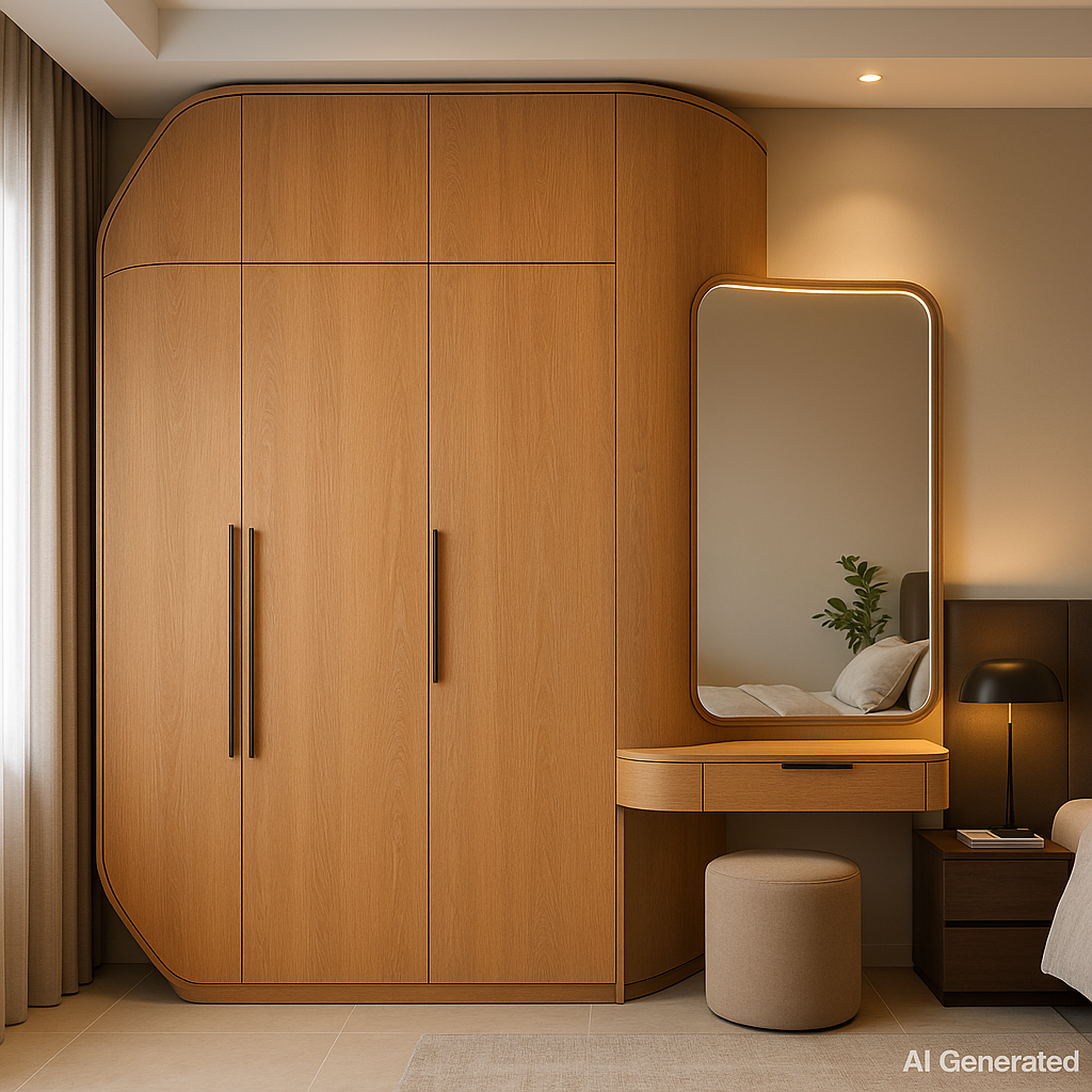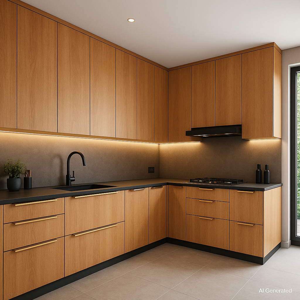 Natural Oak Mist Laminate on plywood, including surface preparation, PU adhesive, matching 1mm edge banding, precision trimming and finishing. Suitable for wardrobes, wall panels, study desks and cabinetry. Rate includes consumables, screws, wastage allowance, protection,. |