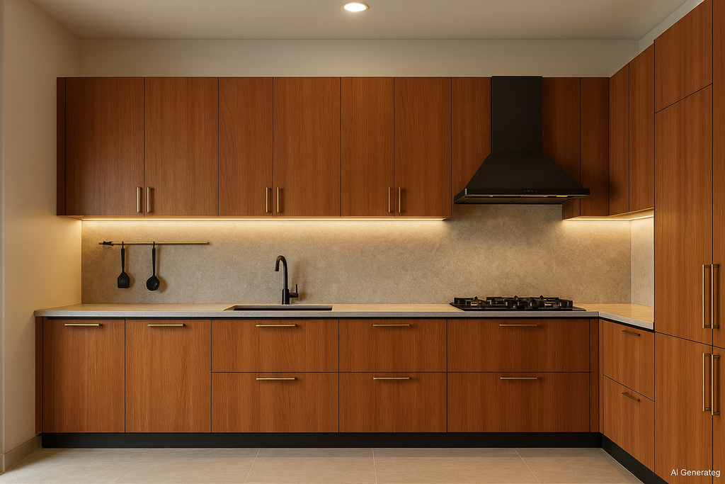 Rustic Cedar Oak Laminate on plywood, including surface preparation, PU adhesive, matching 1mm edge banding, precision trimming and finishing. Suitable for wardrobes, wall panels, study desks and cabinetry. Rate includes consumables, screws, wastage allowance, protection,. |