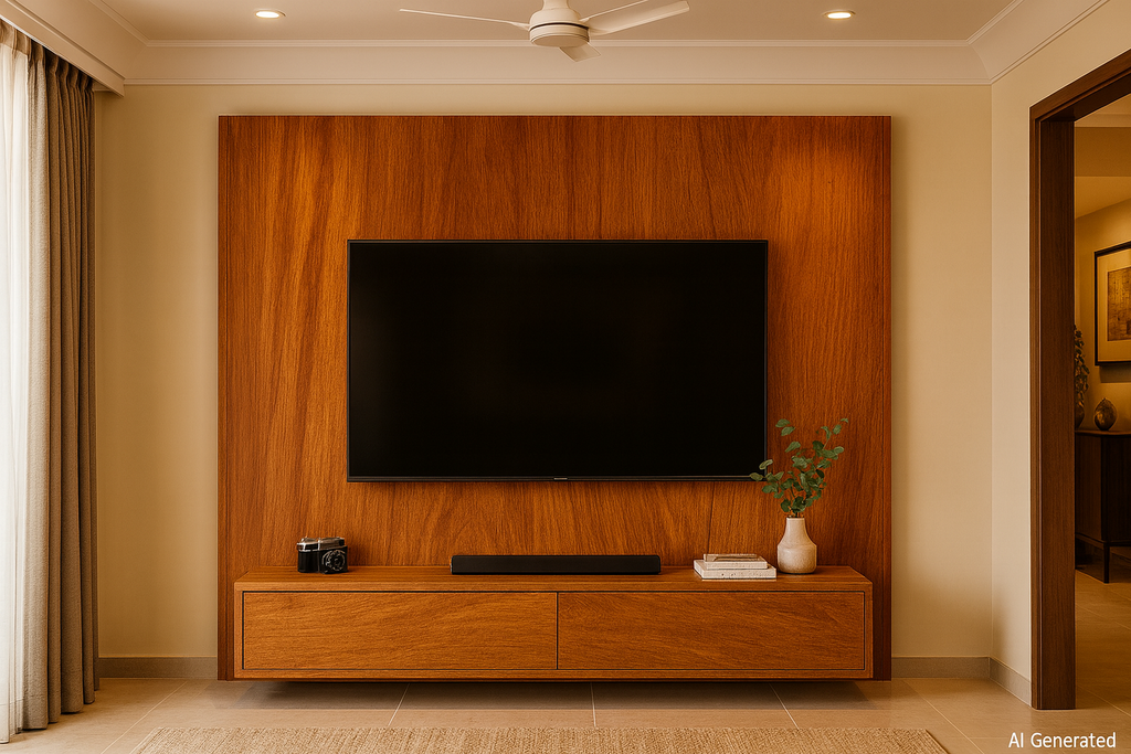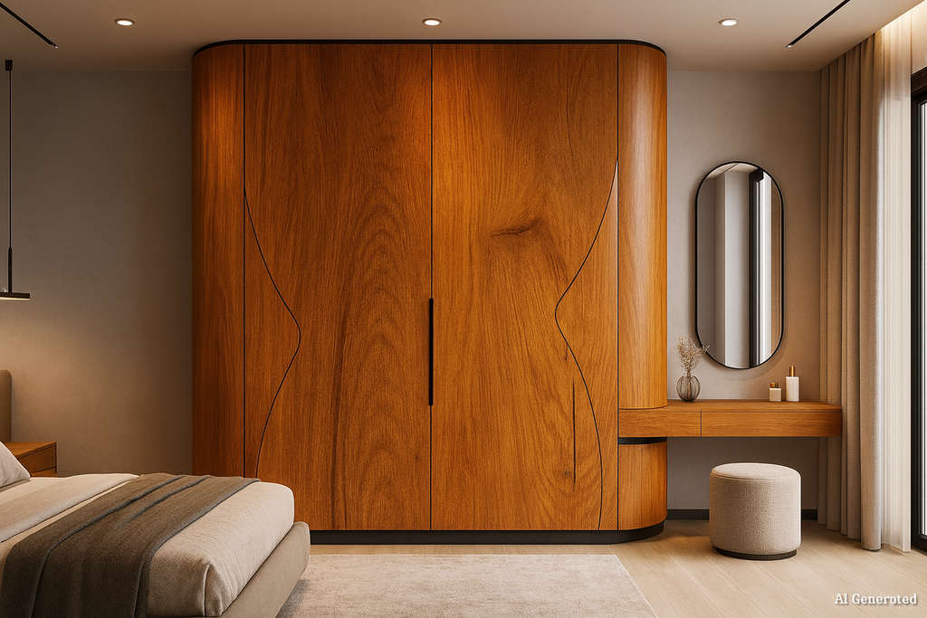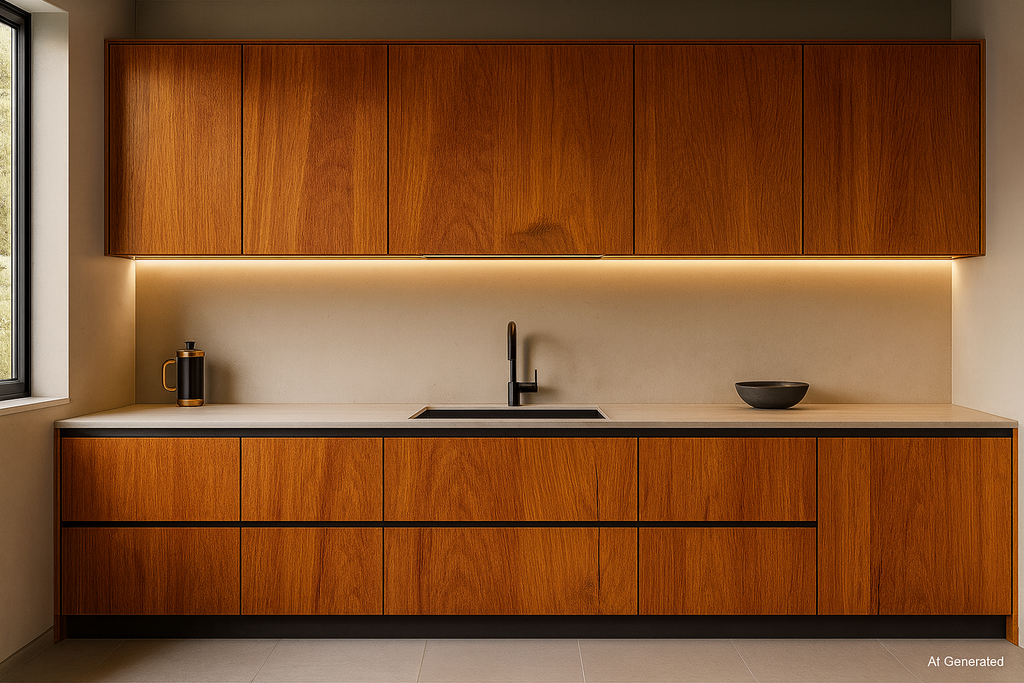 Golden Teak Flame Laminate on plywood, including surface preparation, PU adhesive, matching 1mm edge banding, precision trimming and finishing. Suitable for wardrobes, wall panels, study desks and cabinetry. Rate includes consumables, screws, wastage allowance, protection,. |