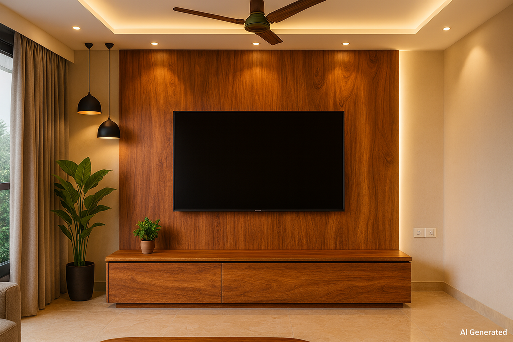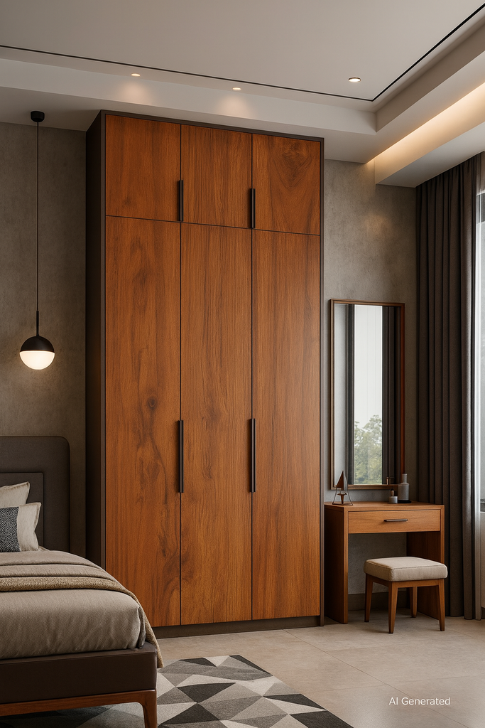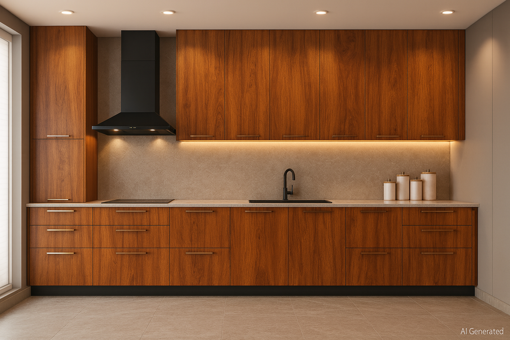 Auburn Teak Grain Laminate on plywood, including surface preparation, PU adhesive, matching 1mm edge banding, precision trimming and finishing. Suitable for wardrobes, wall panels, study desks and cabinetry. Rate includes consumables, screws, wastage allowance, protection,. |