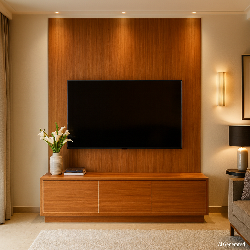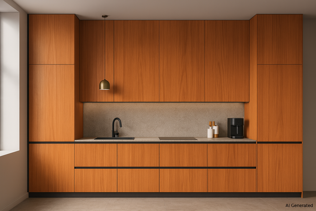Golden Harvest Oak Laminate on plywood, including surface preparation, PU adhesive, matching 1mm edge banding, precision trimming and finishing. Suitable for wardrobes, wall panels, study desks and cabinetry. Rate includes consumables, screws, wastage allowance, protection,. |