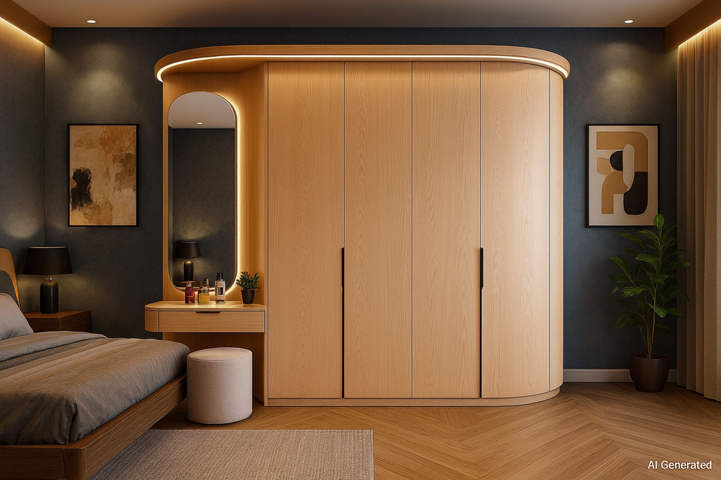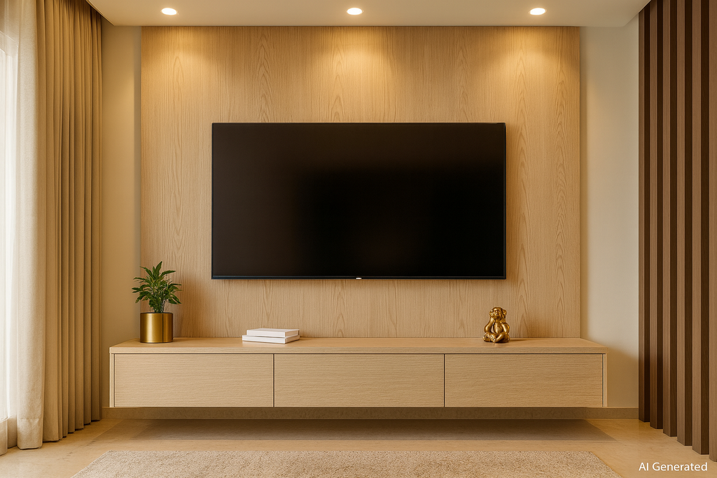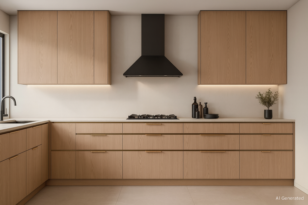 Sandy Oak Beige Laminate on plywood, including surface preparation, PU adhesive, matching 1mm edge banding, precision trimming and finishing. Suitable for wardrobes, wall panels, counters and cabinetry. Rate includes consumables, screws, wastage allowance, protection, touch-ups,. |