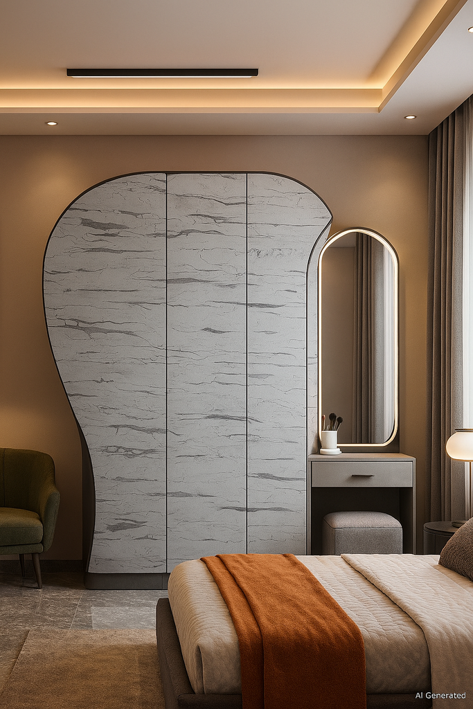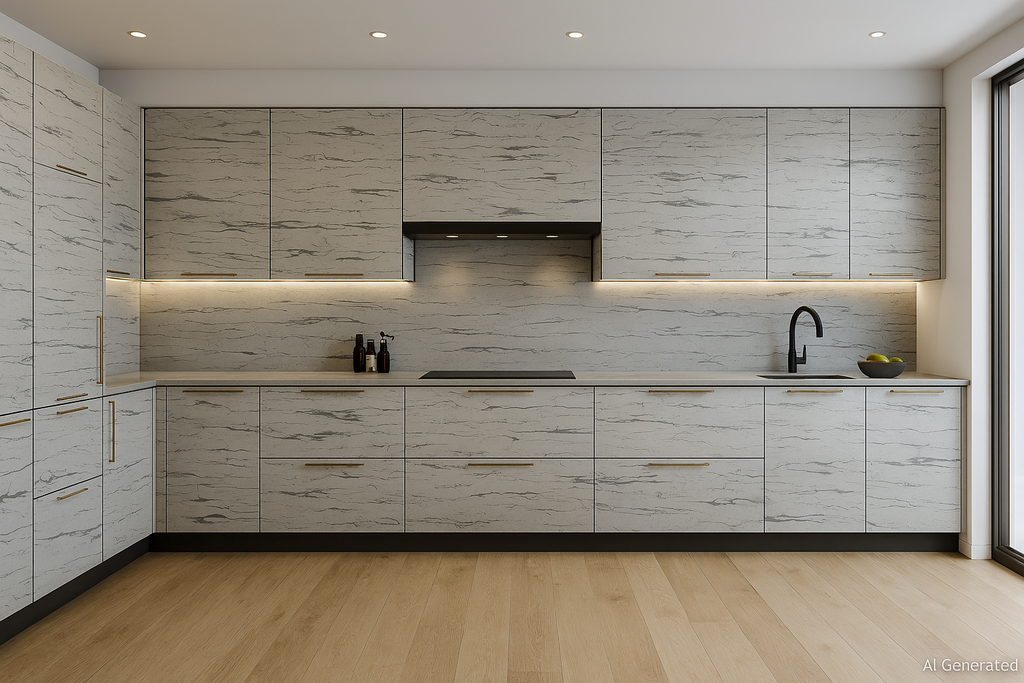 Provide and install Cracked Ice Grey laminate on plywood including surface preparation, alignment, adhesive application, edge banding, trimming and polishing. Applicable to wardrobes, study tables and TV units. Rate includes hardware allowances, consumables, wastage, protection, and final cleaning. |