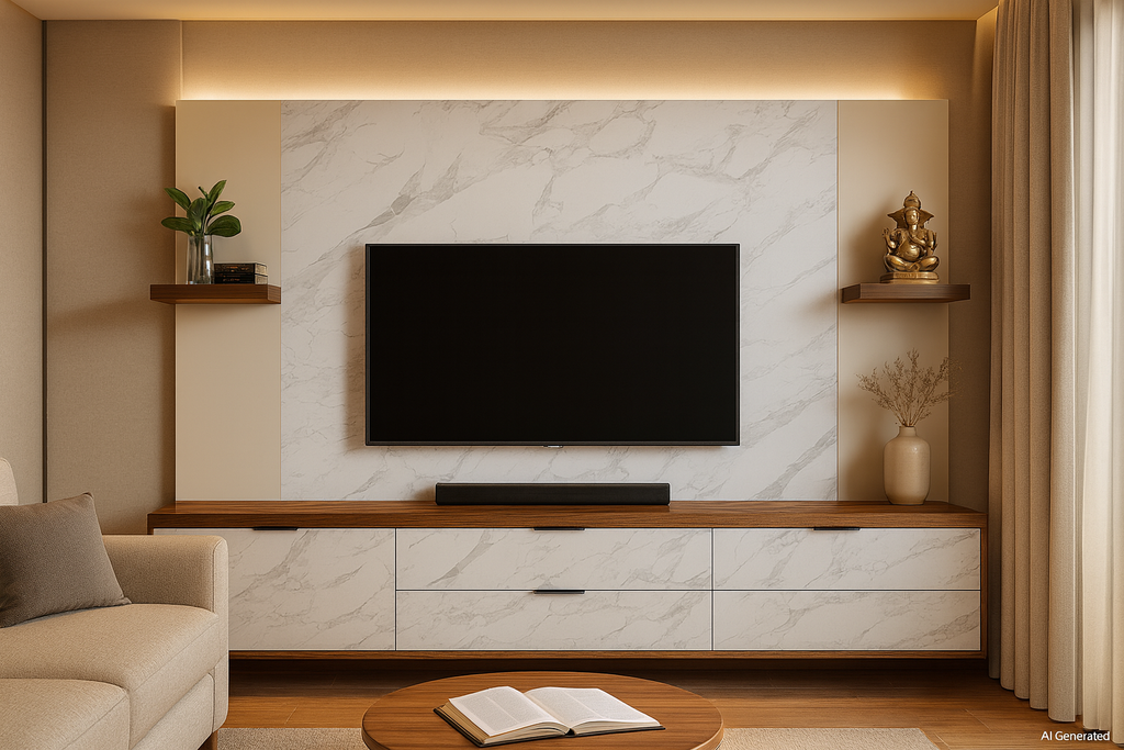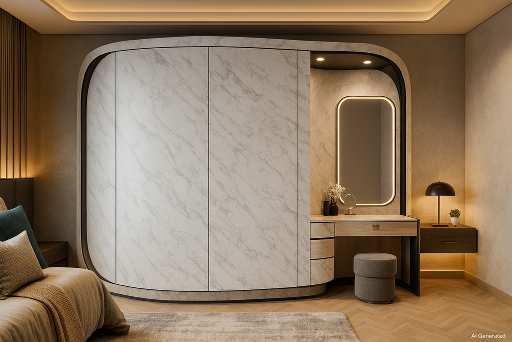 Carrara White Marble Laminate applied on plywood using adhesive including cutting, pasting and finishing work ensuring neat alignment and durable interior surface installation.. |