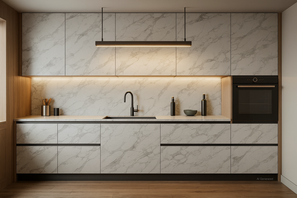 Carrara White Marble Laminate with elegant soft-grey veining. |